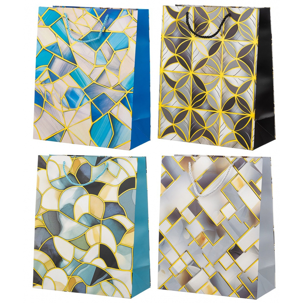Подарочный пакет: плотный, цветной с рисунком, с золотым тиснением /ассорти/; размер 31*41*12 см. В коробке: 160 шт.