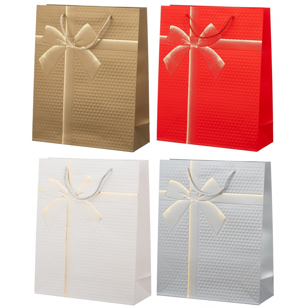 Подарочный пакет: "БАНТ"; плотный, фактурный цветной /ассорти/, золотое тиснение, размер 26*10*23 см. В коробке: 240 шт.