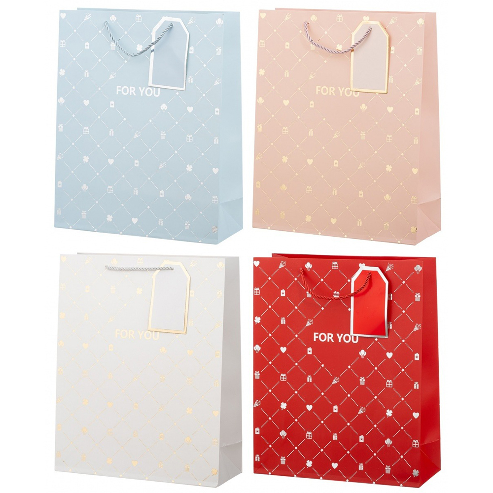 Подарочный пакет: "FOR YOU"; плотный, цветной с рисунком, /ассорти/, размер 26*10*32 см. В коробке: 240 шт.