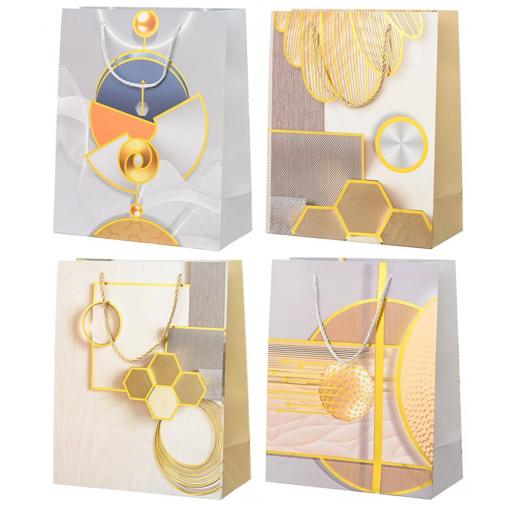 Подарочный пакет: "Геометрия"; плотный, цветной с рисунком, фольгированный,/ассорти/; размер 31*12*41 см. В коробке: 160 шт.