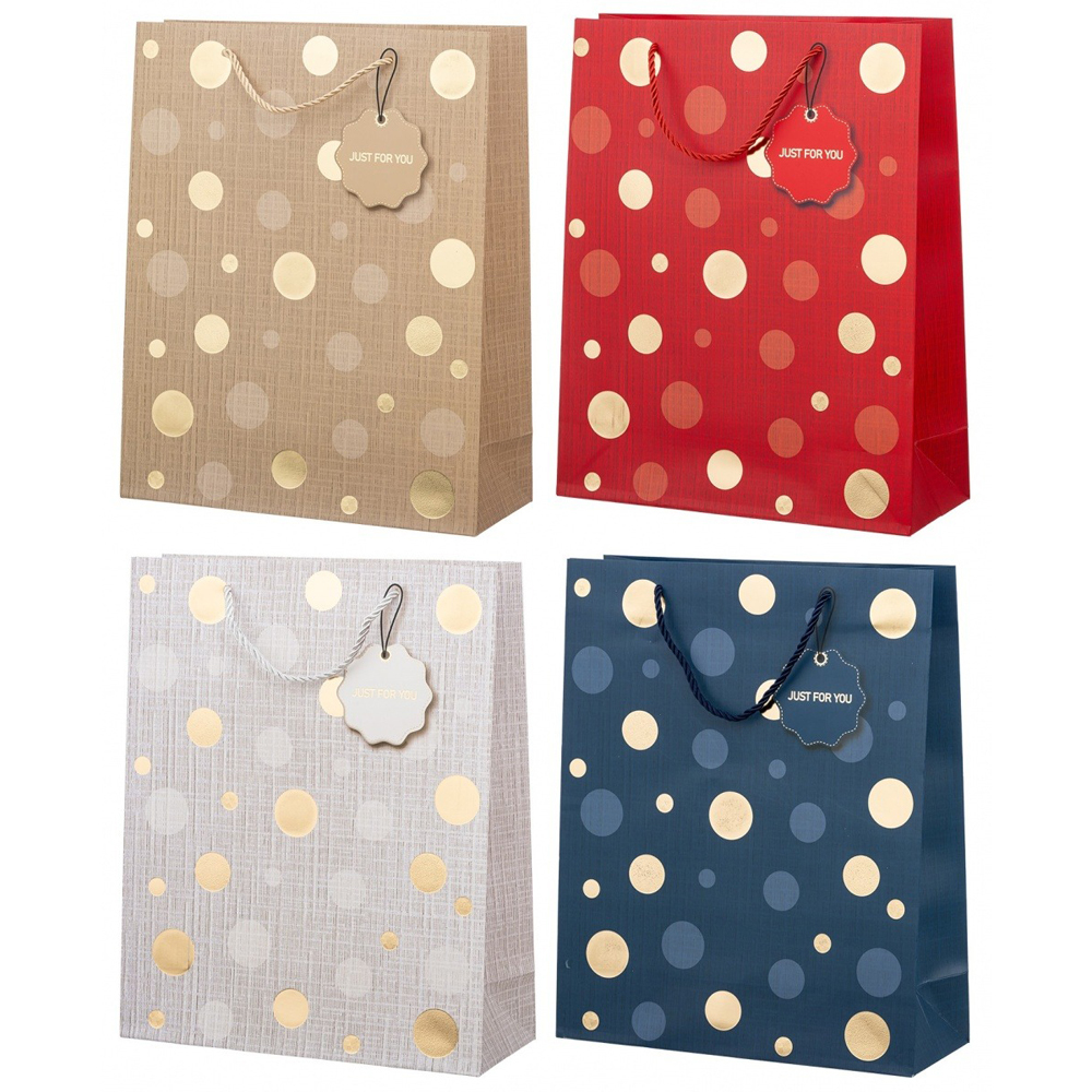 Подарочный пакет: "JUST FOR YOU"; плотный, цветной /ассорти/, рисунок-золотое тиснение горох, размер 26*10*32 см. В коробке: 240 шт.