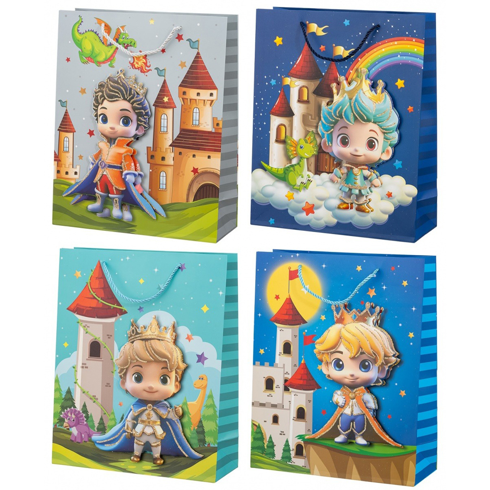 Подарочный пакет: "МАЛЕНЬКИЙ ПРИНЦ"; плотный, цветной с рисунком, объёмная аппликация с блёстками /ассорти/, размер 30*12*40 см. В коробке: 160 шт.