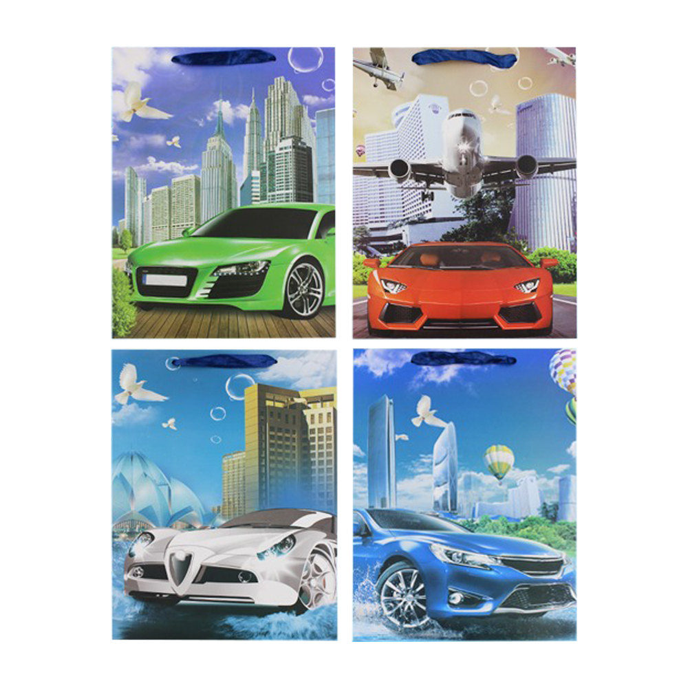 Подарочный пакет: "Машины"; плотный (210 г/кв.м/, цветной с рисунком /ассорти/; размер 32*45*12 см. В коробке 160 шт.