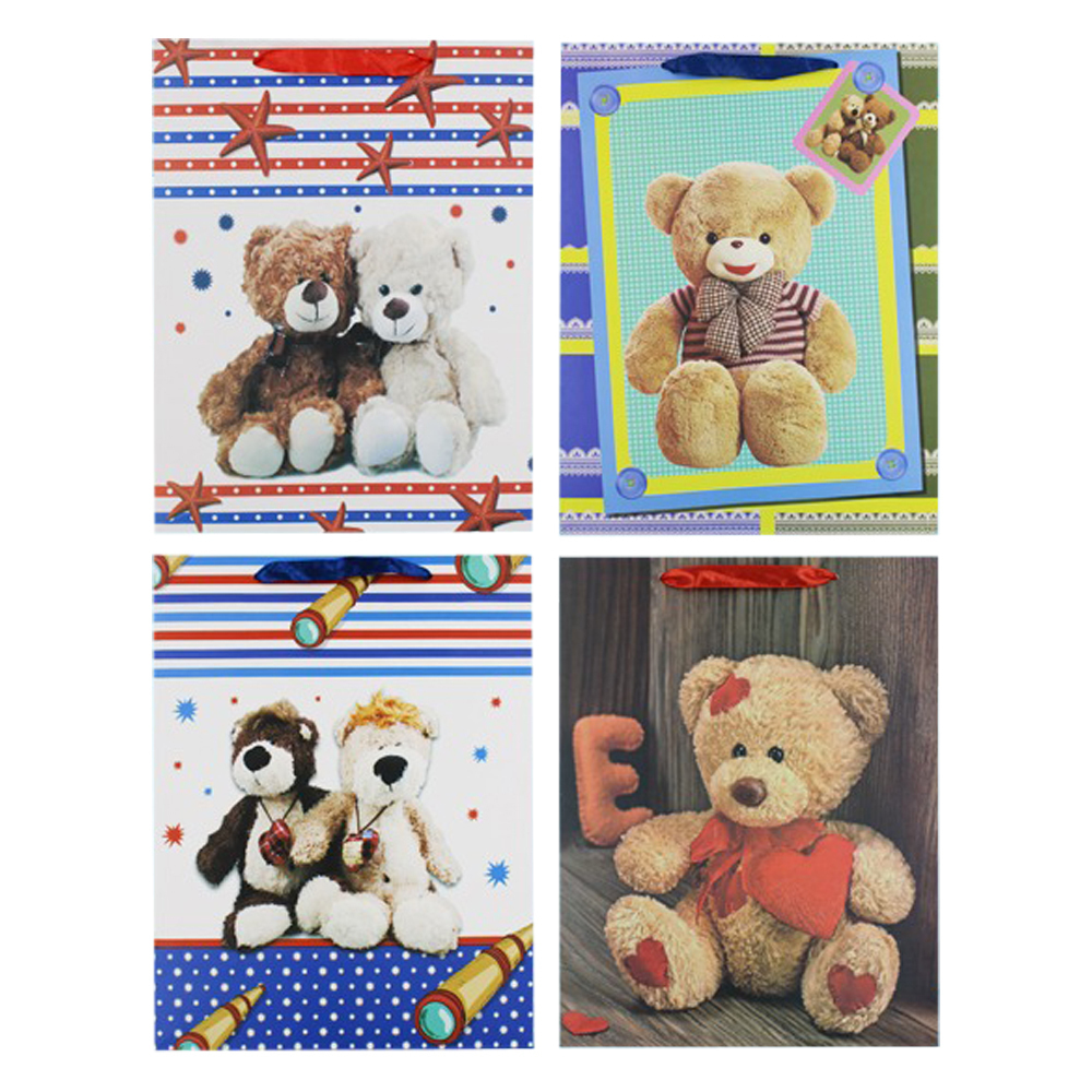 Подарочный пакет: "Мишки"; плотный (210 г/кв.м/, цветной с рисунком /ассорти/; размер 18*23*10 см. В коробке 320 шт.