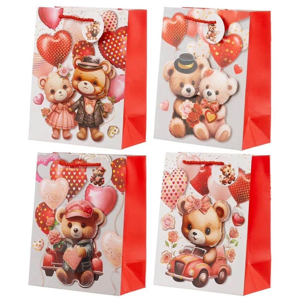 Подарочный пакет: "МИШКИ"; плотный, цветной с рисунком и блёстками, с объёмной аппликацией /ассорти/; размер 30*12*40см. В коробке 160 шт.