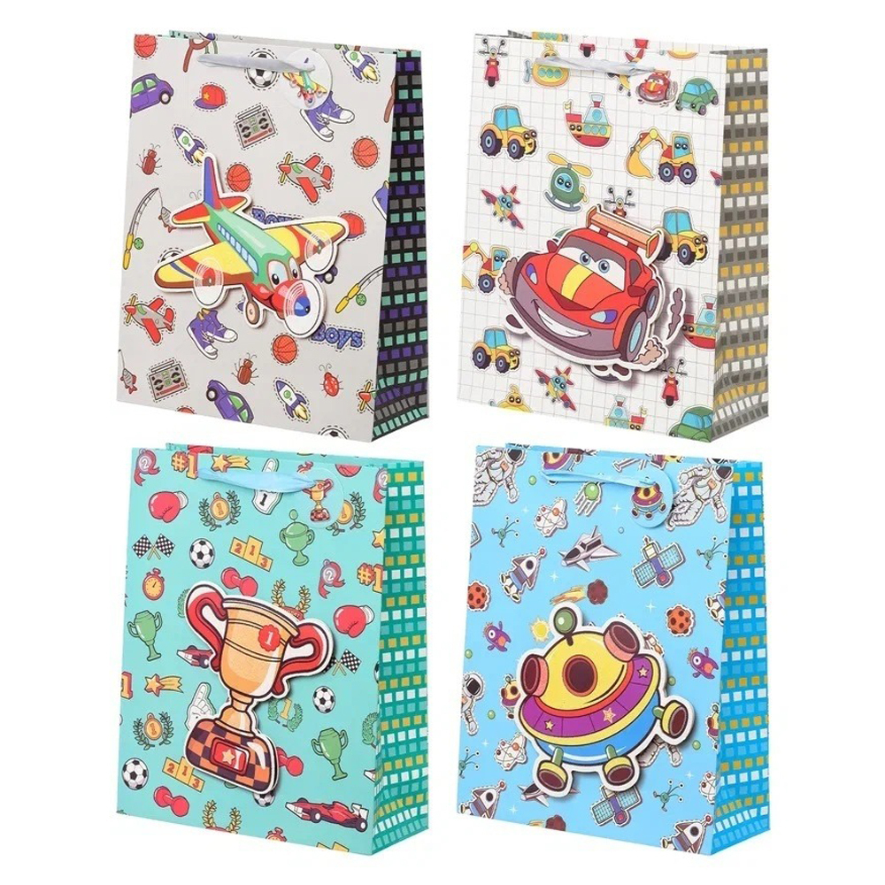 Подарочный пакет: "МУЖСКАЯ ТЕМАТИКА"; для мальчиков; плотный, цветной с рисунком, объёмная аппликация-машина, кубок, самолёт /ассорти/; размер 26*10*32 см. В коробке 240 шт.