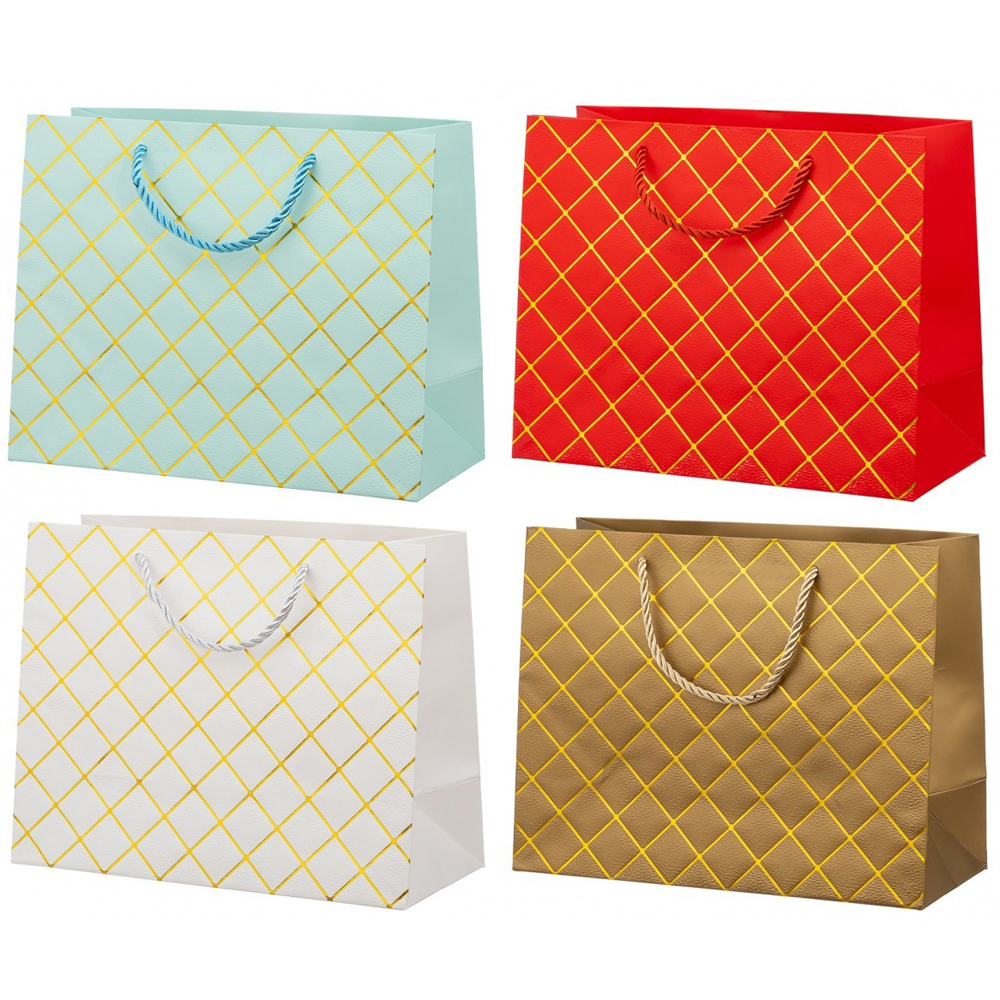 Подарочный пакет: "РОМБЫ"; горизонтальный, плотный, цветной /ассорти/, золотое тиснение, размер 31*41*12 см. В коробке: 160 шт.