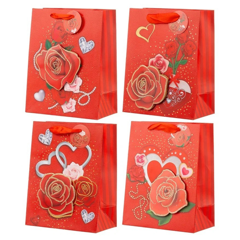Подарочный пакет: "РОЗЫ"; плотный, цветной с рисунком и блёстками, с объёмной аппликацией /ассорти/; размер 30*12*40 см. В коробке 160 шт.