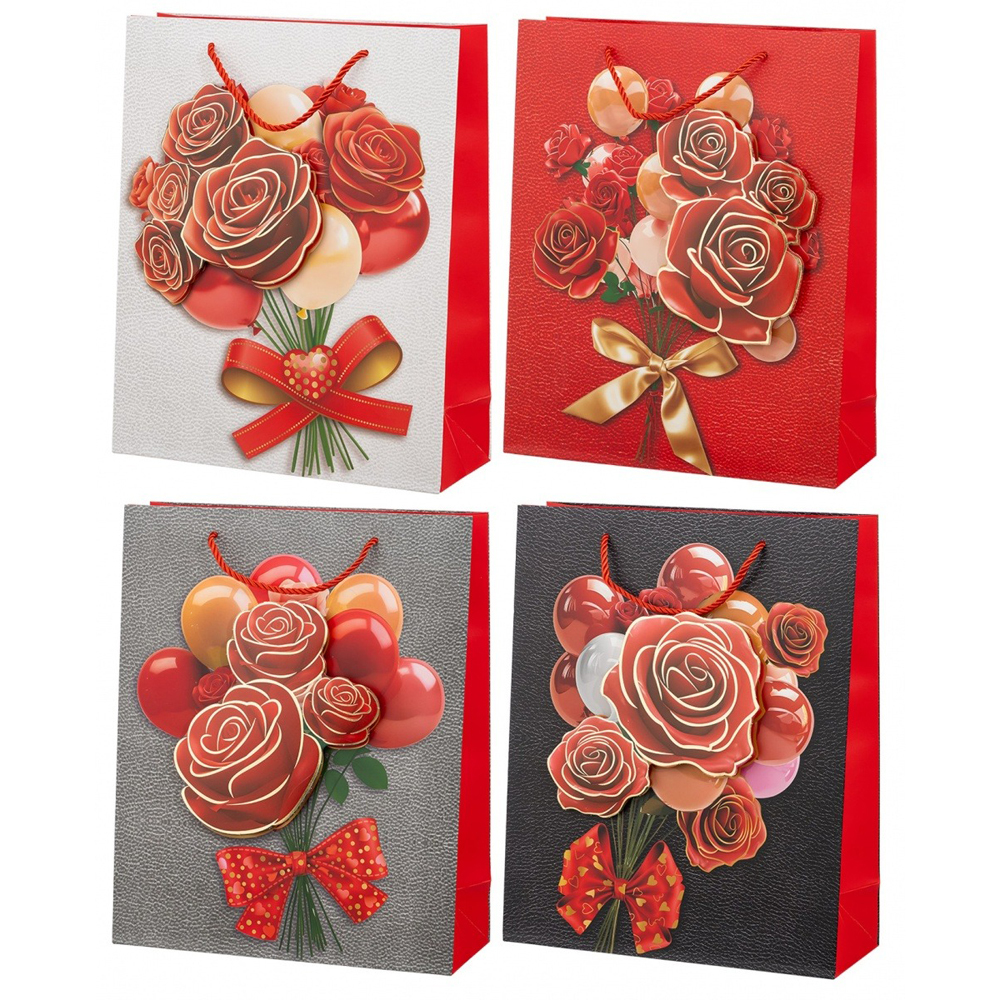 Подарочный пакет: "РОЗЫ"; плотный, цветной с рисунком, объёмная аппликация /ассорти/, размер 30*12*40 см. В коробке: 160 шт.