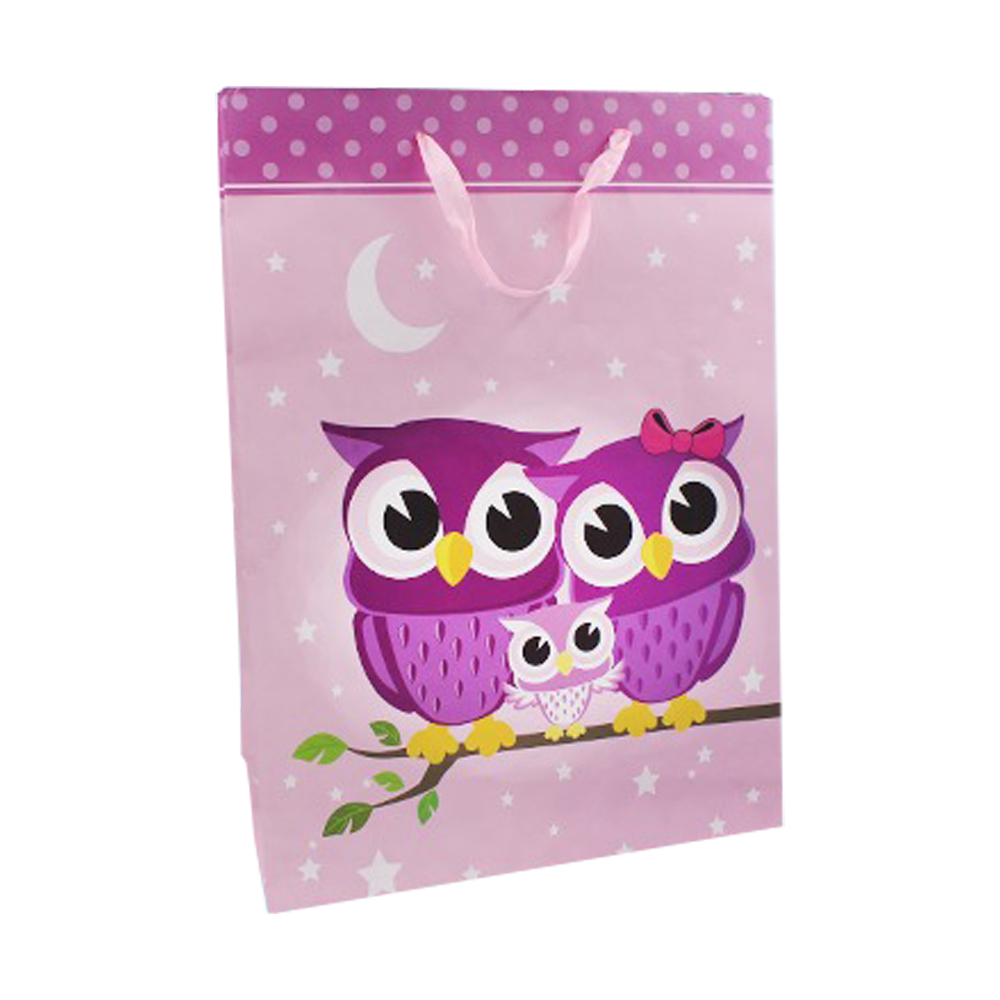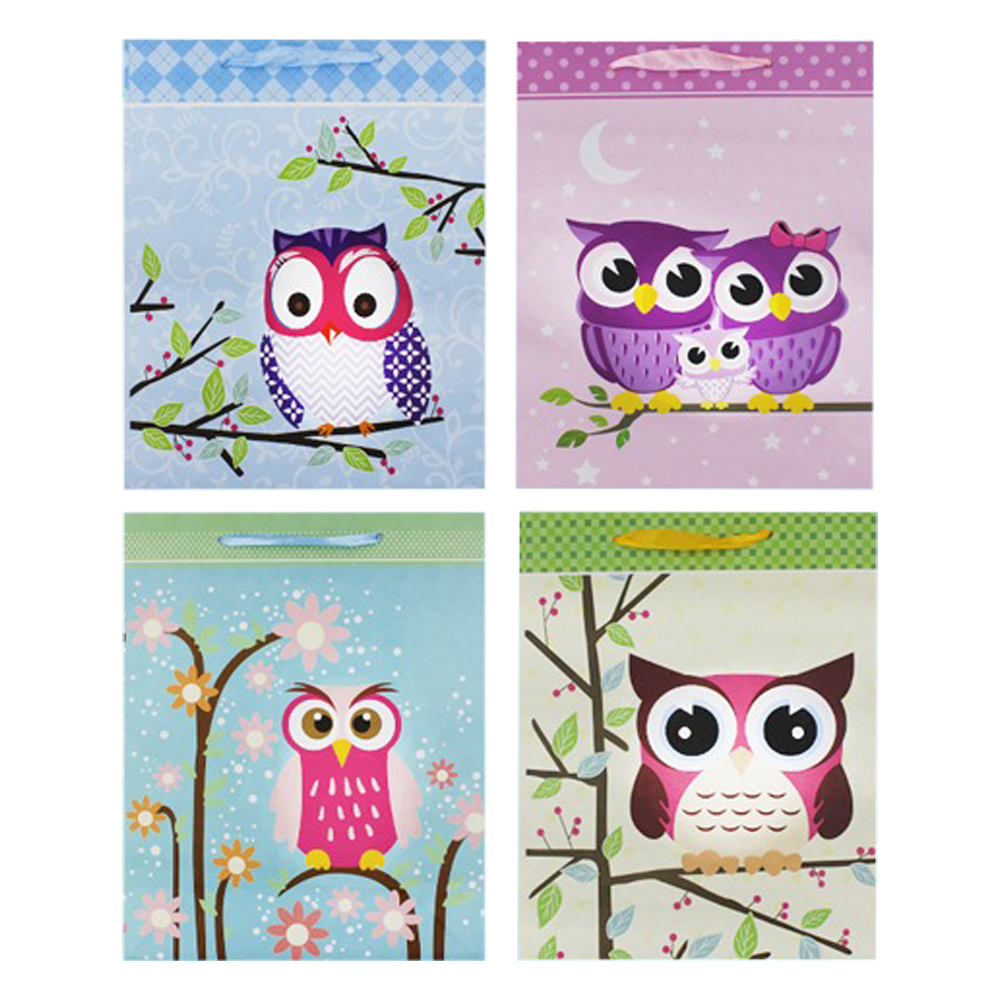 Подарочный пакет: "Сова", цветной /ассорти/, размер 32*44*11 см. В коробке 200 шт.