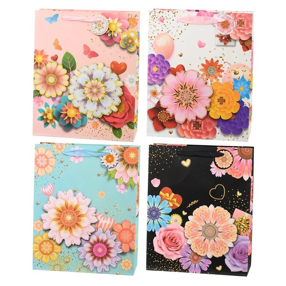 Подарочный пакет: "ЦВЕТЫ"; плотный, цветной с рисунком, объёмная аппликация с блёстками /ассорти/; размер 26*10*32 см. В коробке 240 шт.