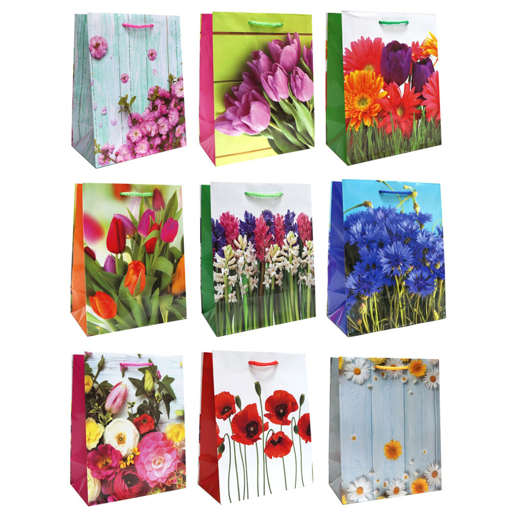 Подарочный пакет: бумажный, рисунок-цветы /ассорти/, 32*44*11 см. В коробке 144 шт.