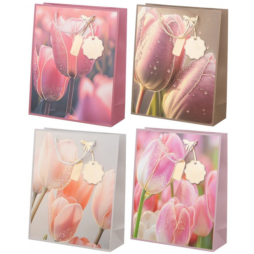 Подарочный пакет: "ТЮЛЬПАНЫ"; плотный, цветной с рисунком, /ассорти/, золотое тиснение, размер 26*10*32 см. В коробке: 240 шт.