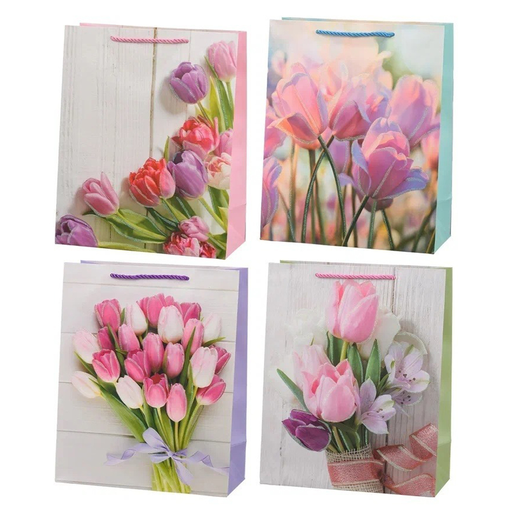 Подарочный пакет: "ТЮЛЬПАНЫ"; плотный, цветной с рисунком, с блёстками; размер 31*41*12 см. В коробке 160 шт.