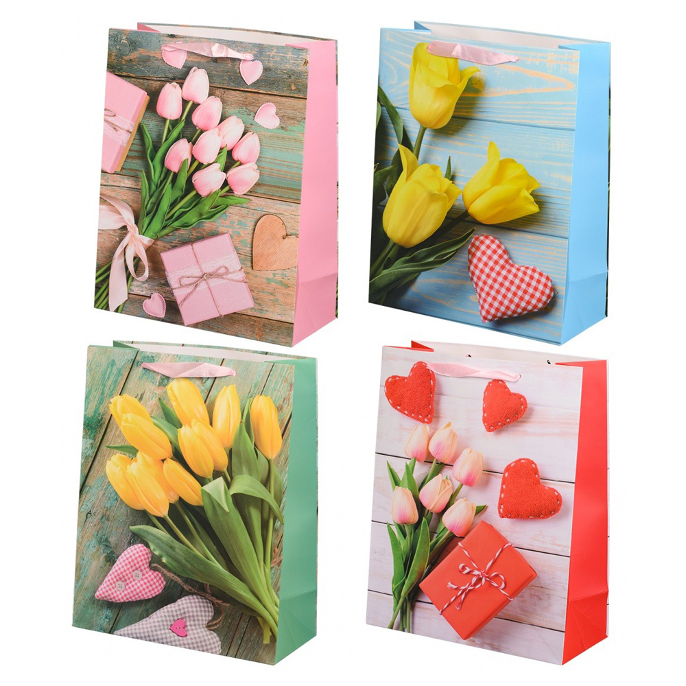 Подарочный пакет: "ТЮЛЬПАНЫ"; плотный, цветной с рисунком /ассорти/; размер 32*45*12 см В коробке 160 шт.
