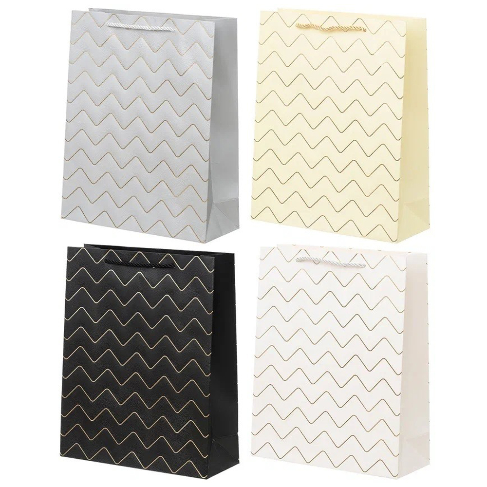 Подарочный пакет: "ЗИГ-ЗАГ"; плотный, цветной, золотое тиснение-зиг-заг /ассорти/; размер 30*12*40 см. В коробке: 160 шт.