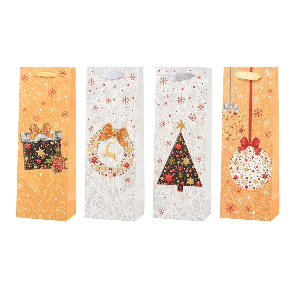 Подарочный пакет: для бутылок; "С НОВЫМ ГОДОМ!"; плотный, цветной с рисунком, золотое тиснение /ассорти/; размер 12,7*8,3*36 см. Количество в коробке: 360 шт.