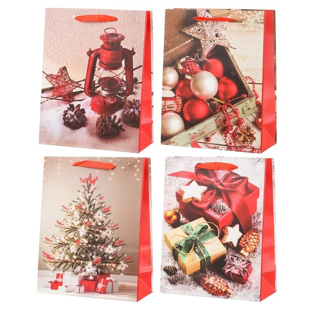 Подарочный пакет: "НОВОГОДНИЕ"; плотный, цветной с рисунком /ассорти/; размер 26*32*11 см. Количество в коробке: 240 шт.