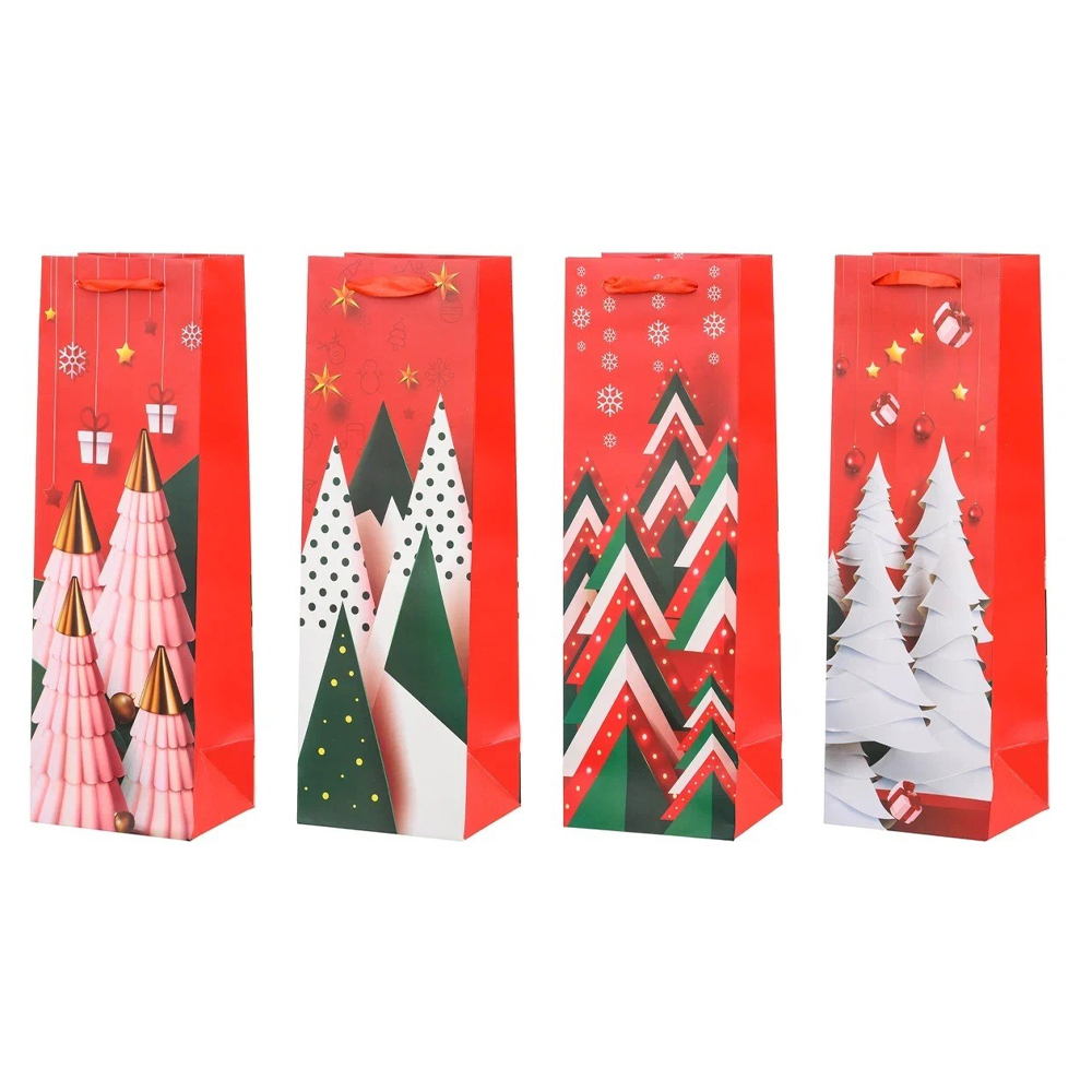 Подарочный пакет: "НОВОГОДНИЕ"; глянцевый, красный с рисунком /ассорти/; размер 12*36*10 см. Количество в коробке: 360 шт.