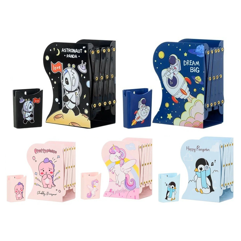 Подставка-лоток для книг: металлическая, раздвижная, вертикальная, с 3-мя отделениями имеет скругленные углы, силиконовые бесшумные накладки и яркий дизайн. Размер19х10(50)х14 см. Подставка раздвигается от 10 до 50 см, что позволяет разместить большое количество книг и тетрадей. На боковой части подставки металлический карман-органайзер на магните, который можно использовать для хранения разных мелочей. Упаковка - картонная коробка. В коробке: 30 шт.