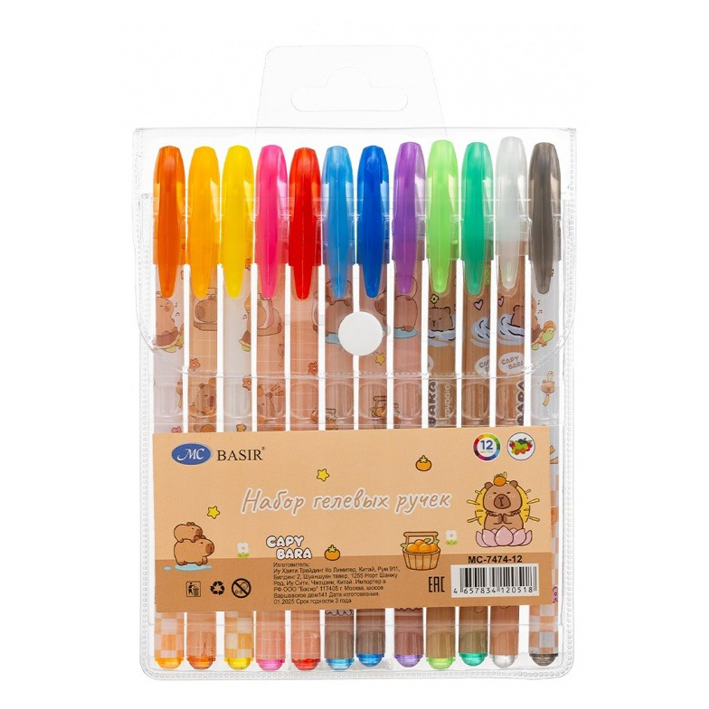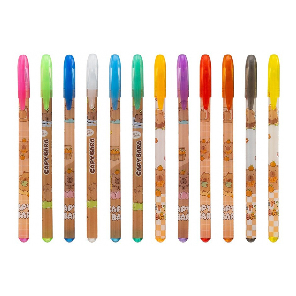 Набор гелевых ручек: "КАПИБАРА"; с блёстками, цветной пластиковый корпус с рисунком, цветной колпачок /в цвет чернил/, упаковка с европодвесом, 12 цветов.