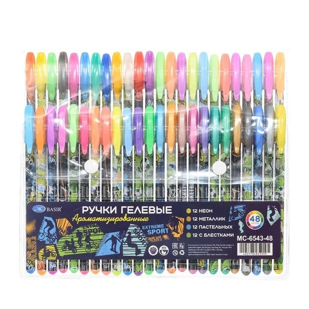Набор гелевых ручек: "СПОРТ"; ароматизированные, 12 с блёстками, 12 пастельных, 12 неон, 12 металлик, цветной пластиковый корпус с рисунком, цветной колпачок /в цвет чернил/, упаковка с европодвесом, 48 цветов.В коробке 36 наборов.