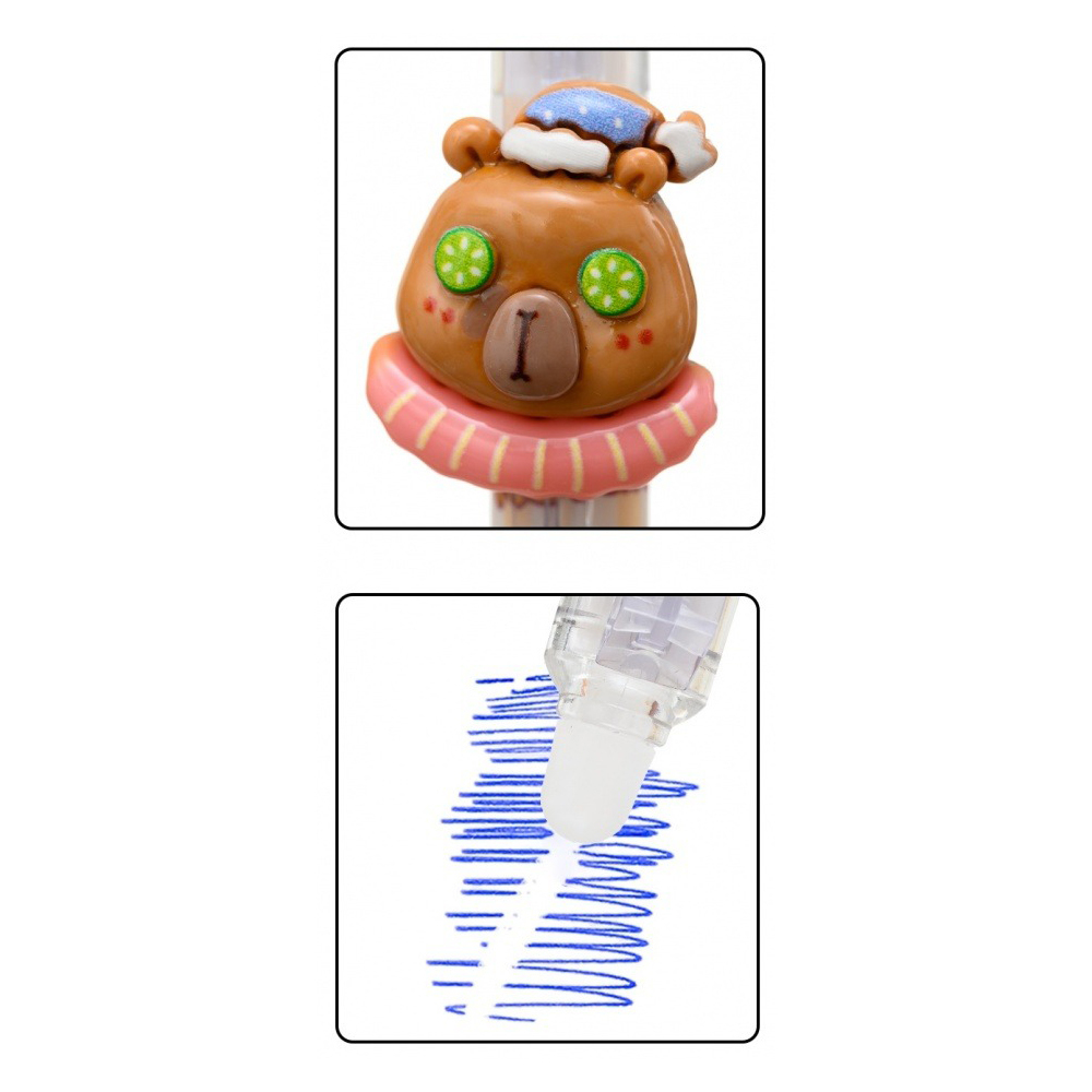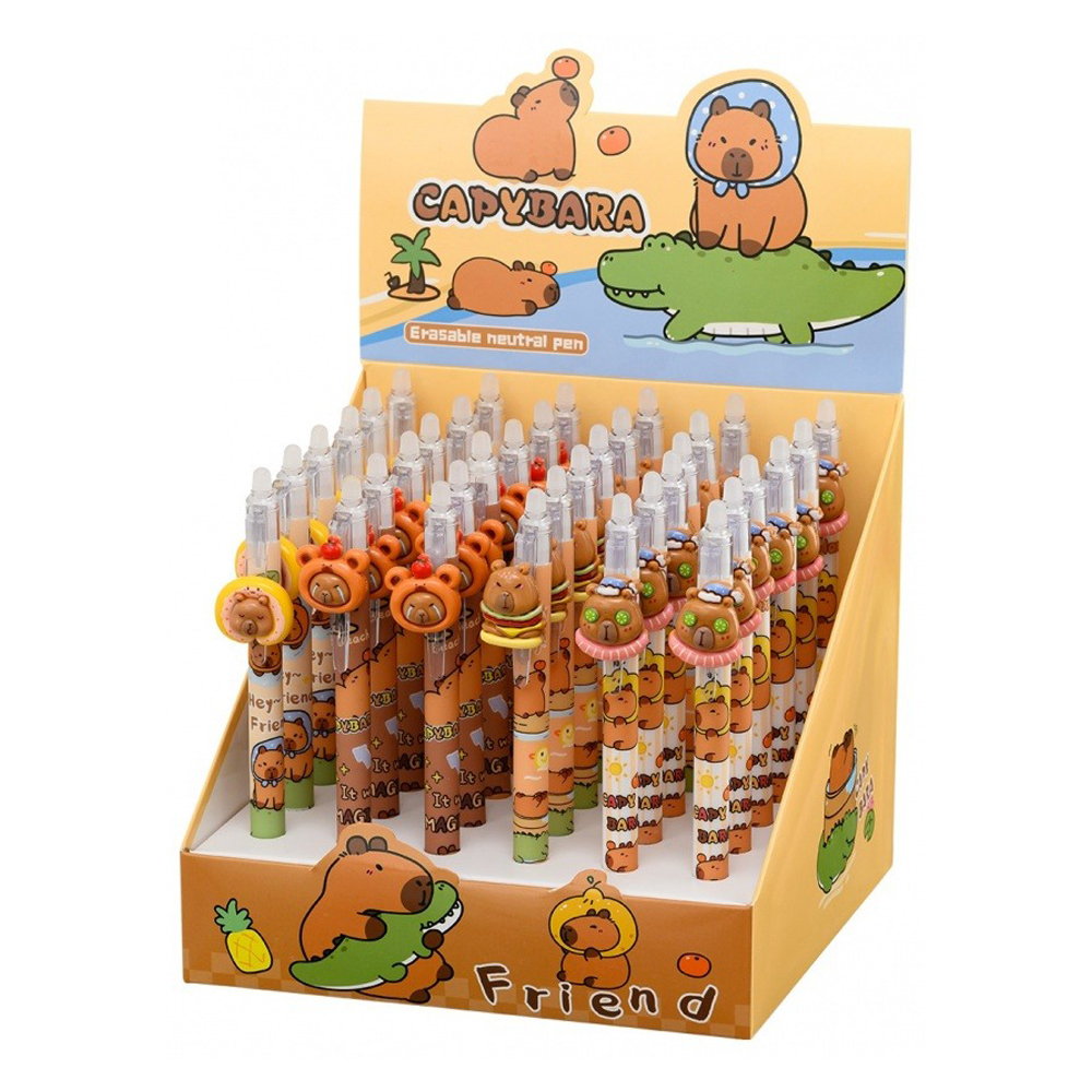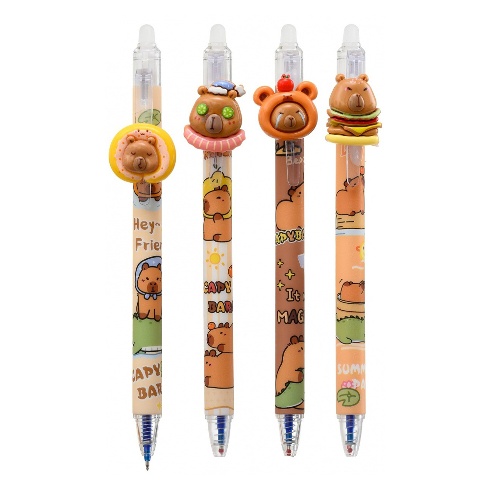 Авторучка со стираемыми чернилами гелевая:"КАПИБАРА"; цветной с рисунком корпус /ассорти/, клип в форме капибары; толщина пишущего наконечника-0,5 mm; цвет чернил-синий.