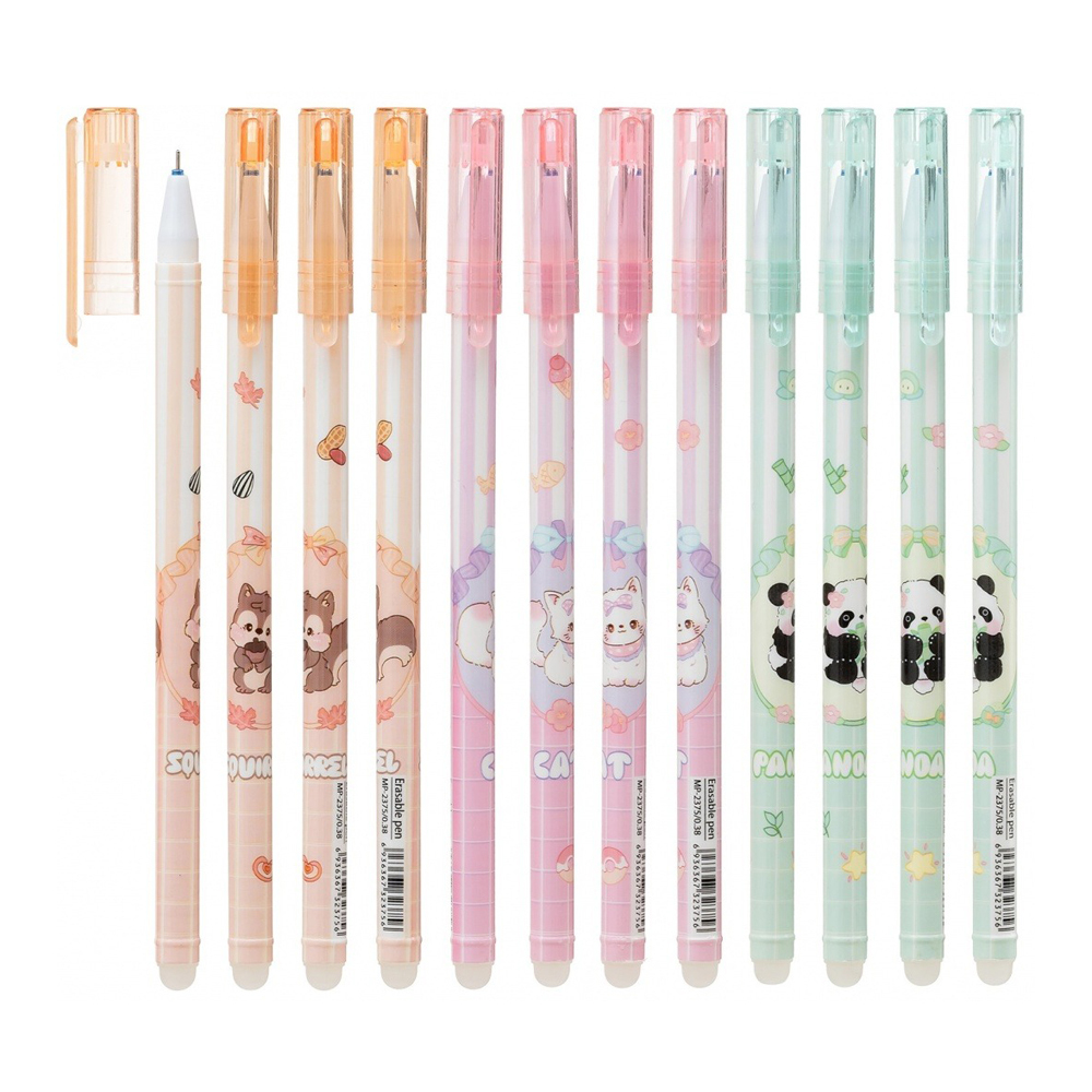 Ручка со стираемыми чернилами гелевая: "ЖИВОТНЫЕ"; цветной с рисунком корпус /ассорти/; толщина пишущего наконечника-0,38 mm; цвет чернил-синий; в пластиковой упаковке.