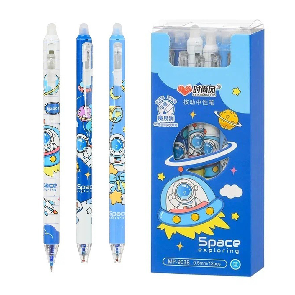 Авторучка со стираемыми чернилами гелевая : "КОСМОС"; цветной с рисунком корпус /ассорти/; толщина пишущего наконечника-0,5 mm; цвет чернил-синий; в пластиковой упаковке и картонном чехле. Кол-во в упаковке: 12 шт.Кол-во в блоке: 144 шт.
