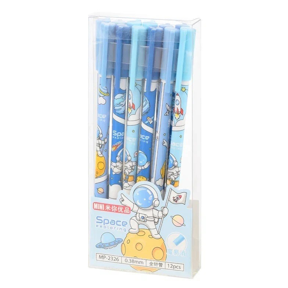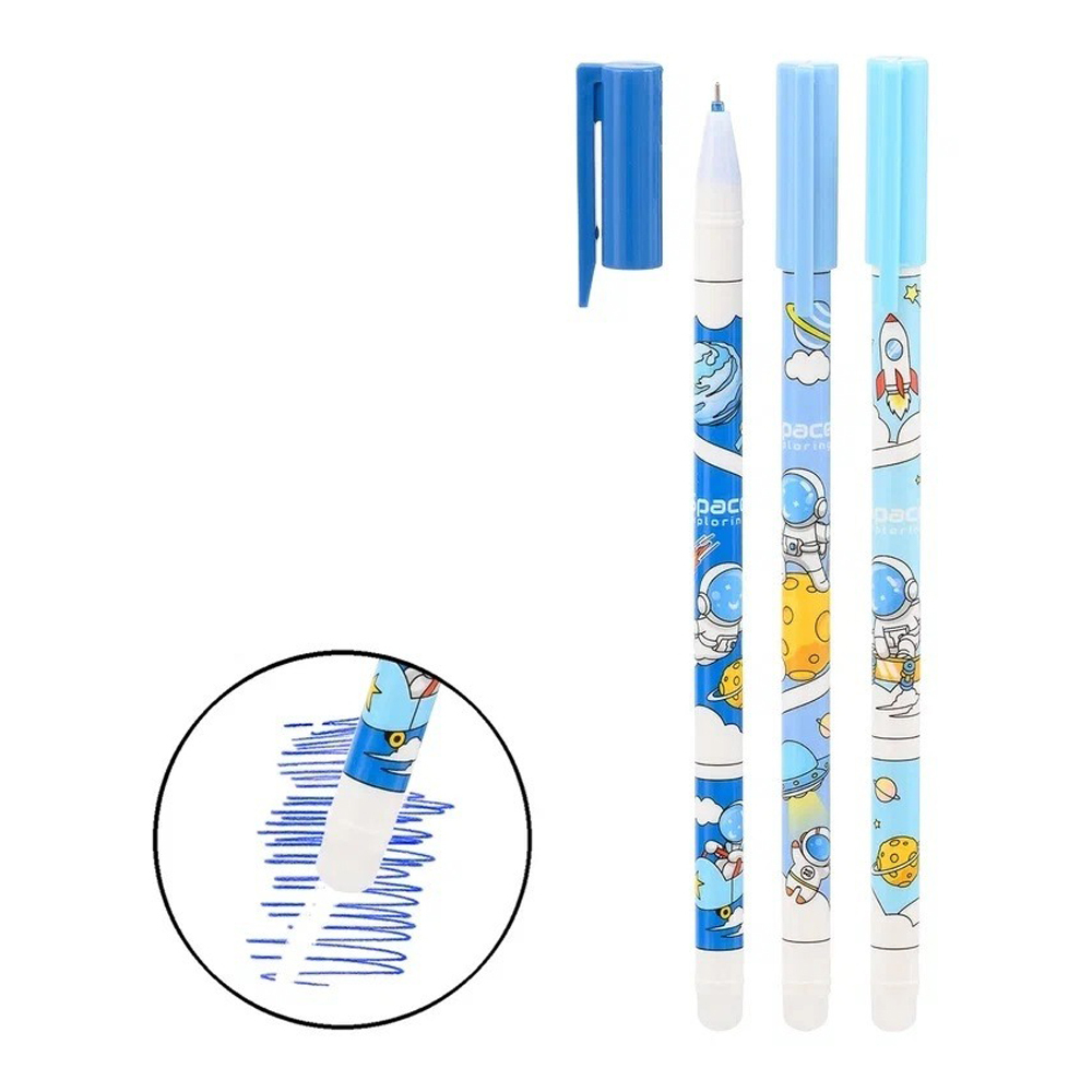 Ручка со стираемыми чернилами гелевая : "КОСМОС"; цветной с рисунком корпус /ассорти/; толщина пишущего наконечника-0,38 mm; цвет чернил-синий; в пластиковой упаковке. Кол-во в упаковке: 12 шт.Кол-во в блоке: 144 шт.