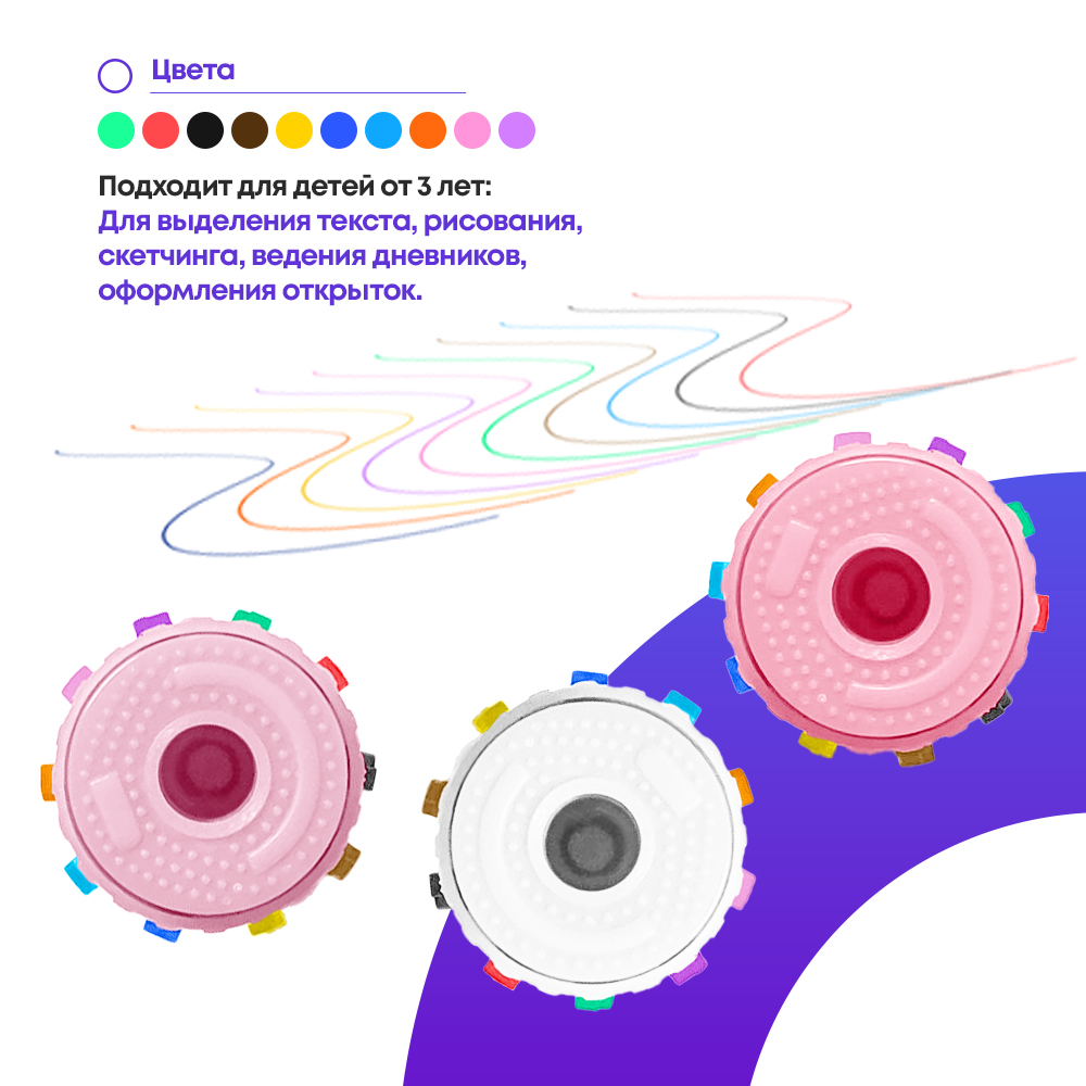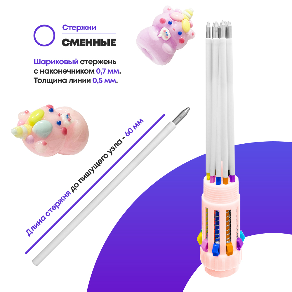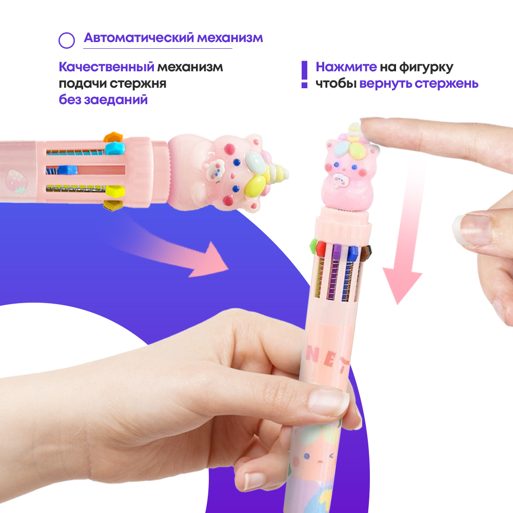 Каждая ручка разработана с учетом детских предпочтений: её яркий, веселый дизайн с игрушечным единорожкой не только привлекает внимание, но и делает процесс написания более увлекательным. Благодаря десяти цветам в одном корпусе, дети смогут легко менять оттенки, подбирая цвет в зависимости от настроения или задания. Это позволит развивать творческие способности, а также сделает занятия более интересными.
