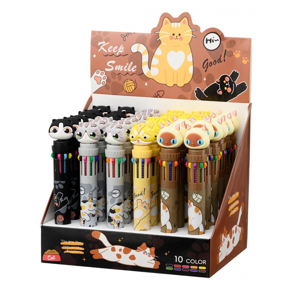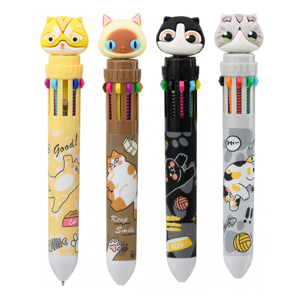 Авторучка 10-и цветная: детская; "КОШКИ"; цветной корпус с рисунком /ассорти/, прорезиненный наконечник - ластик; 0,5 mm.