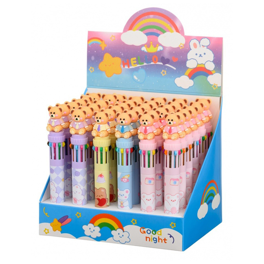 Авторучка 10-и цветная: детская; "МИШКА"; цветной корпус с рисунком /ассорти/, прорезиненный наконечник; 0,5 mm.