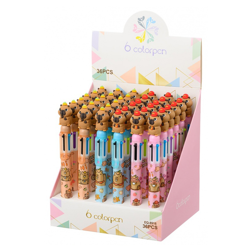 Авторучка 6-ти цветная: детская; "КАПИБАРА"; цветной корпус с рисунком /ассорти/, прорезиненный наконечник; 0,5 mm. В коробке: 972 штук.