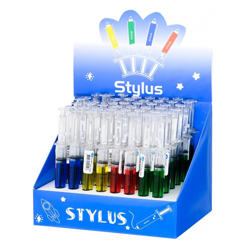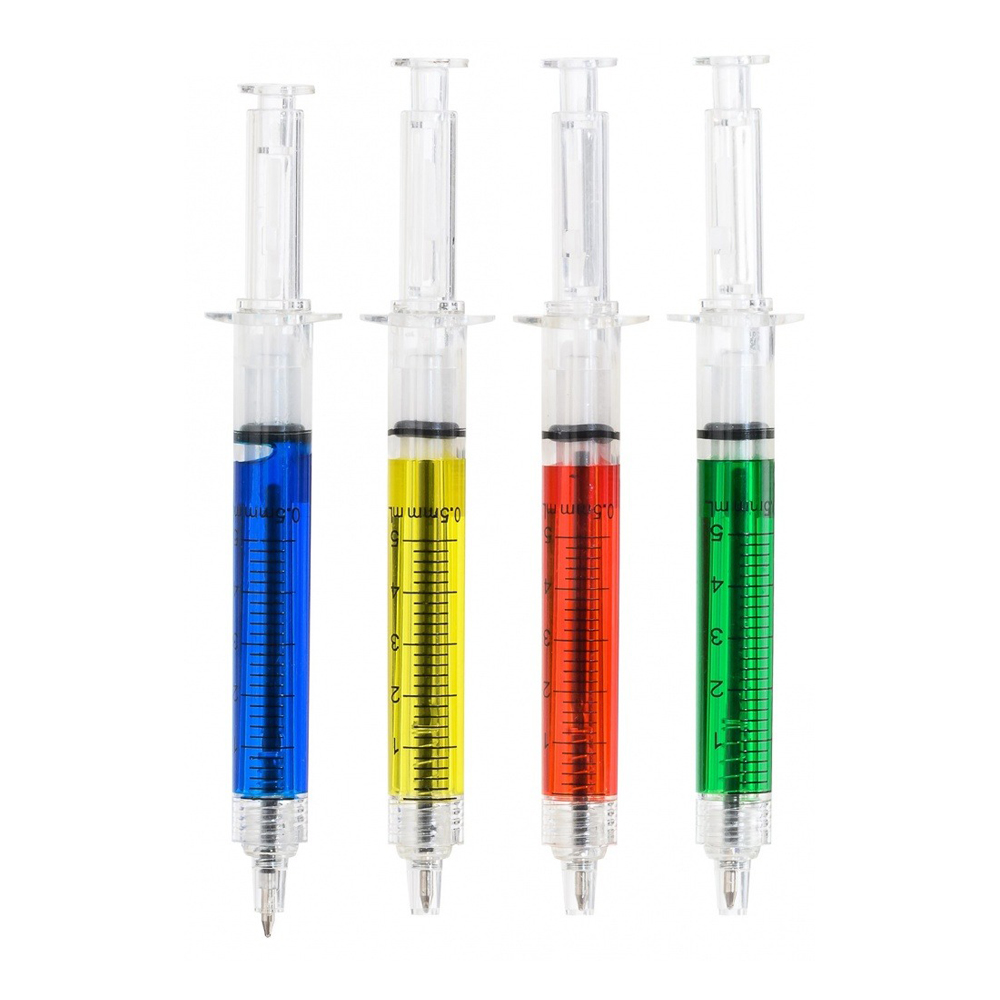 Шариковая авторучка с боковым отжимом: детская "РУЧКА ДОКТОРА"; прозрачный корпус в форме шприца, двойная стенка с цветной жидкостью, цвет чернил синий.