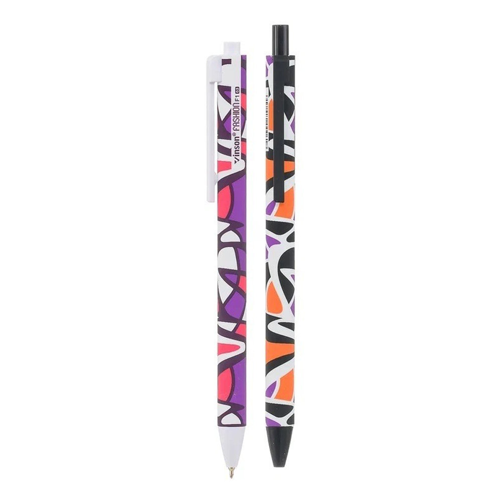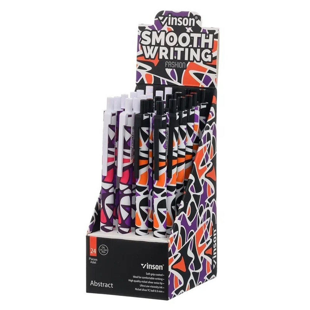 Автоматическая шариковая ручка с чернилами на масляной основе: "VINSON ABSTRACT"; цветной корпус soft /рисунок-абстракция/; цвет чернил синий, 0,7 mm. В коробке 90 упаковок по 24 ручки.