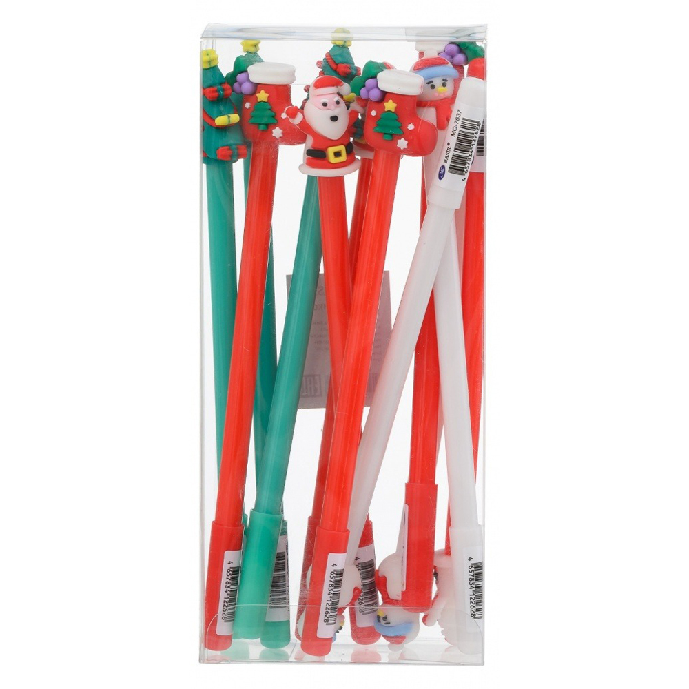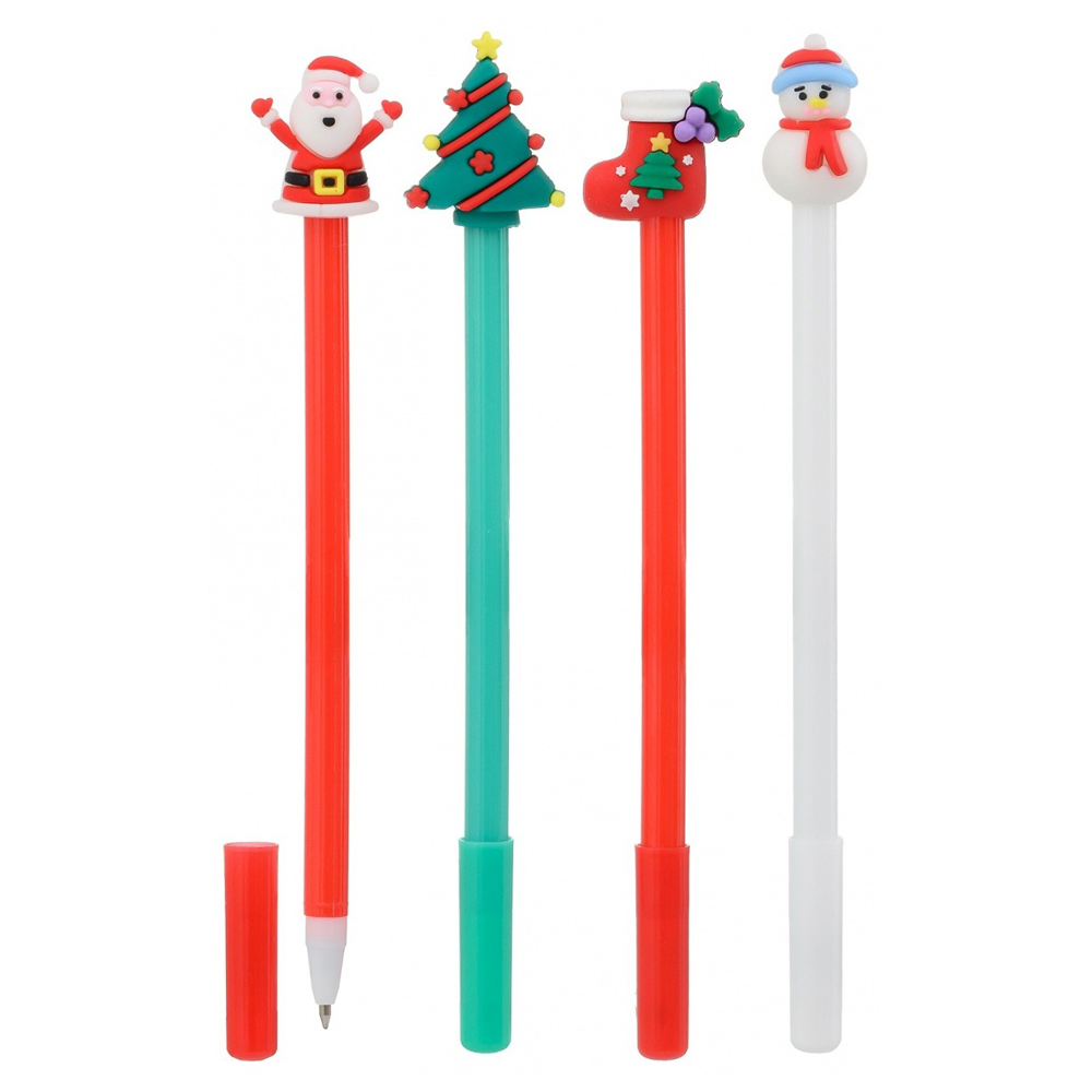 Шариковая ручка: детская; "НОВОГОДНИЕ"; цветной корпус /ассорти/, съёмный прорезиненный наконечник-Дед Мороз, ёлка, снеговик, сапог, в пластиковой упаковке, цвет чернил-синий.