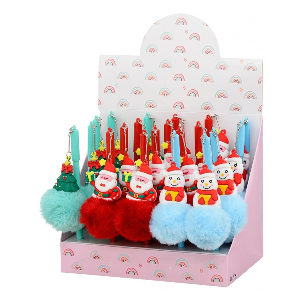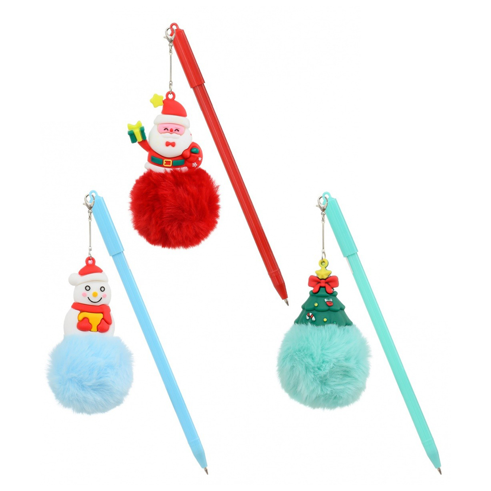 Шариковая ручка: "НОВОГОДНИЕ ПУШИСТИК"; цветной пластиковый корпус /ассорти/, колпачок со съёмным брелоком /8 см/ (резиновые ёлка, снеговик, Дед Мороз - пушистики), цвет чернил -синий.