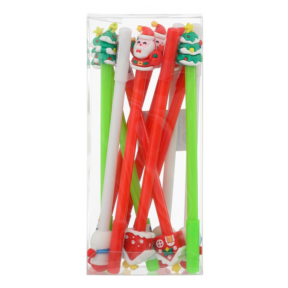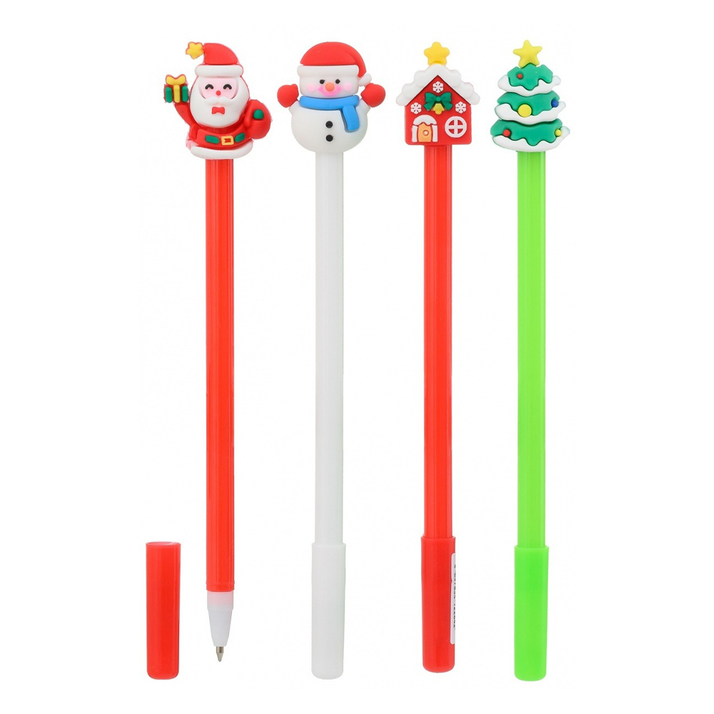 Шариковая ручка: детская; "НОВОГОДНИЕ"; цветной корпус /ассорти/, съёмный прорезиненный наконечник-Дед Мороз, ёлка, снеговик, домик, в пластиковой упаковке, цвет чернил-синий.