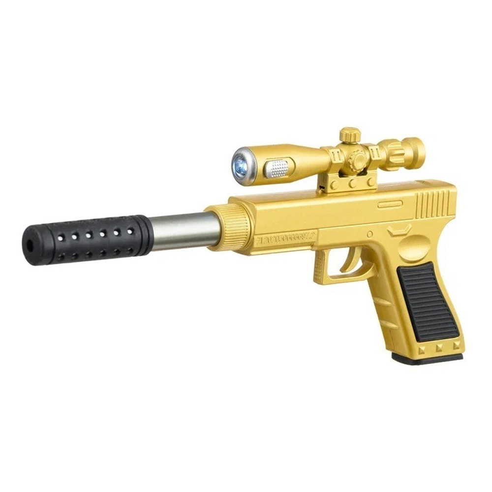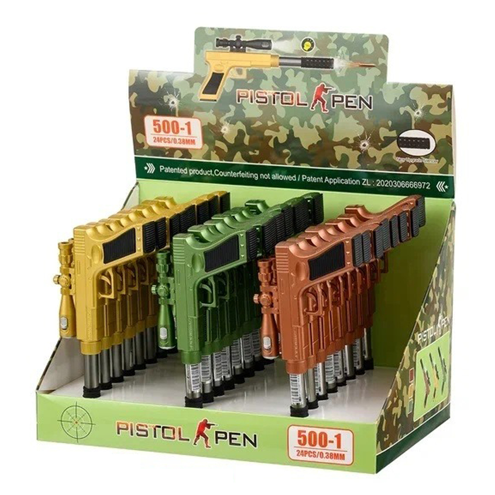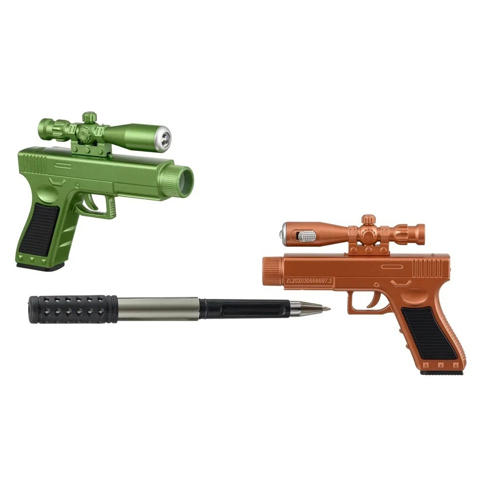 Ручка шариковая: "ПИСТОЛЕТ"; цветной корпус /ассорти/, колпачок выполнен в форме пистолета с прицелом /фонарик/, 0,38 mm, цвет чернил синий.
