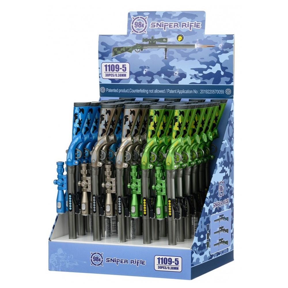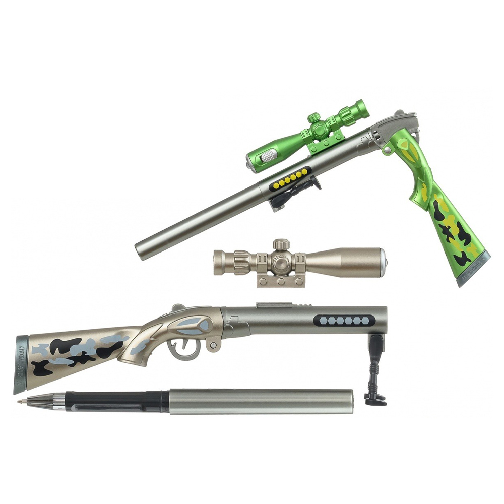 Ручка шариковая: "РУЖЬЁ"; цветной корпус /ассорти/, длина корпуса 23 см, колпачок выполнен в форме ружья, прицел-фонарик, цвет чернил-синий, 0,38 mm.
