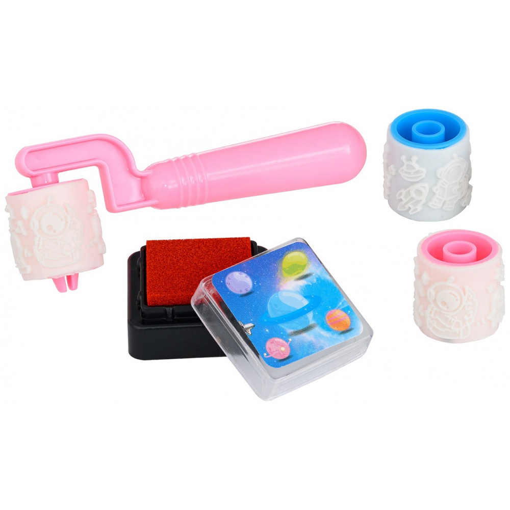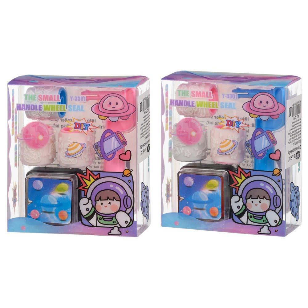 Набор подарочный канцелярский: детский "КОСМОНАВТ"; ролик-штамп фигурный 3 шт+штемпельная подушка, пластиковая упаковка/9*8 см/. В коробке 288 шт.