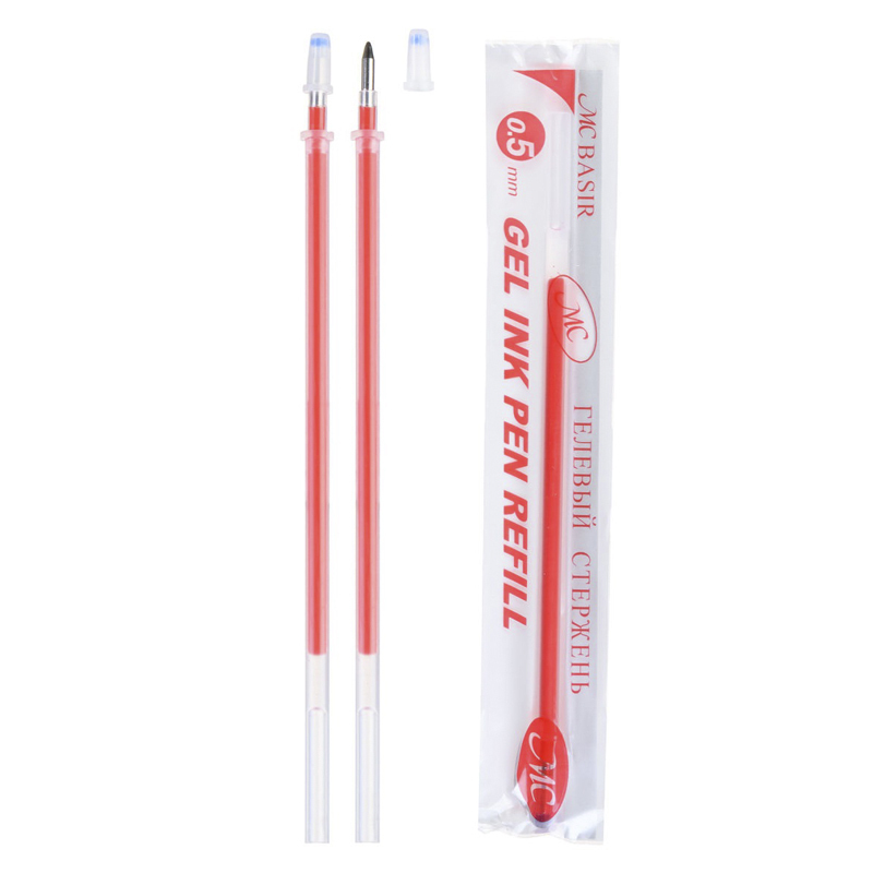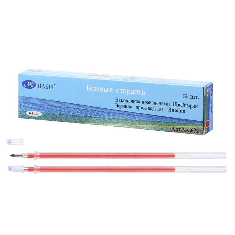 Гелевые стержни: с защитным колпачком, каждый стержень в индивидуальной упаковке, цвет чернил - красный. 129 mm. В коробке 144 упаковки по 12 шт.