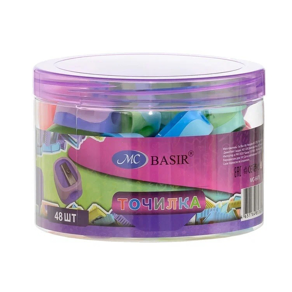 Точилка: одинарная, в форме книги, пластиковая /4 цвета/, размер 3*2,5 см; в прозрачной пластиковой банке. В коробке 60 упаковок по 48 точилок.