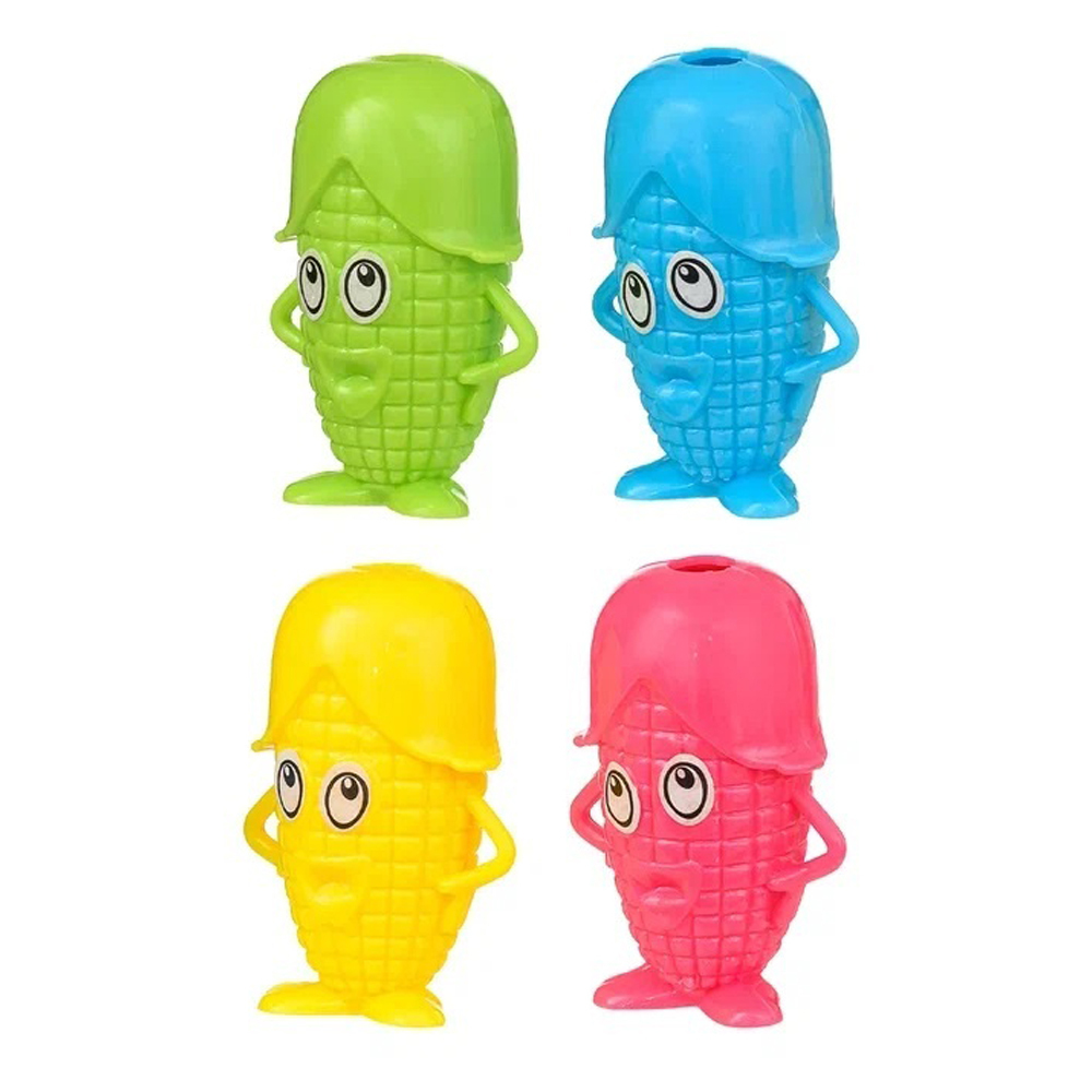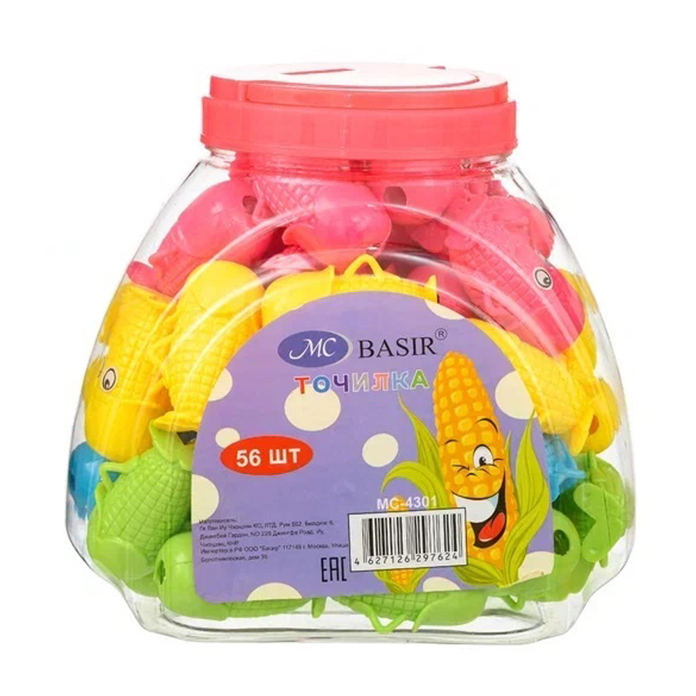 Точилка: "Кукуруза"; с контейнером, цветная /4 цвета/, размер-5,5 см; в прозрачной пластиковой банке-копилке. В коробке: 36 упаковок по 56 точилок.