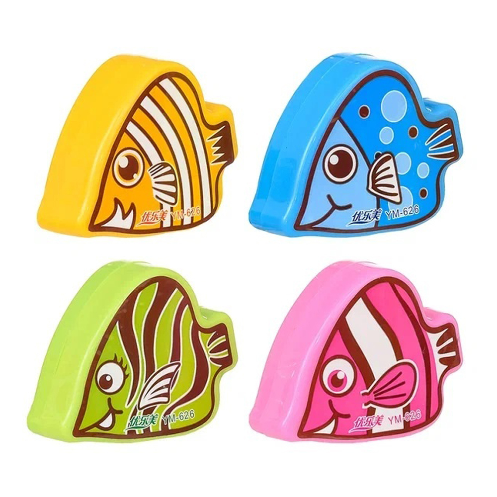 Точилка: "Рыбка"; одинарная с контейнером, пластиковая, яркая /цвета в ассортименте/, 5 см; в прозрачной пластиковой банке. В коробке: 45 упаковок по 56 точилок.