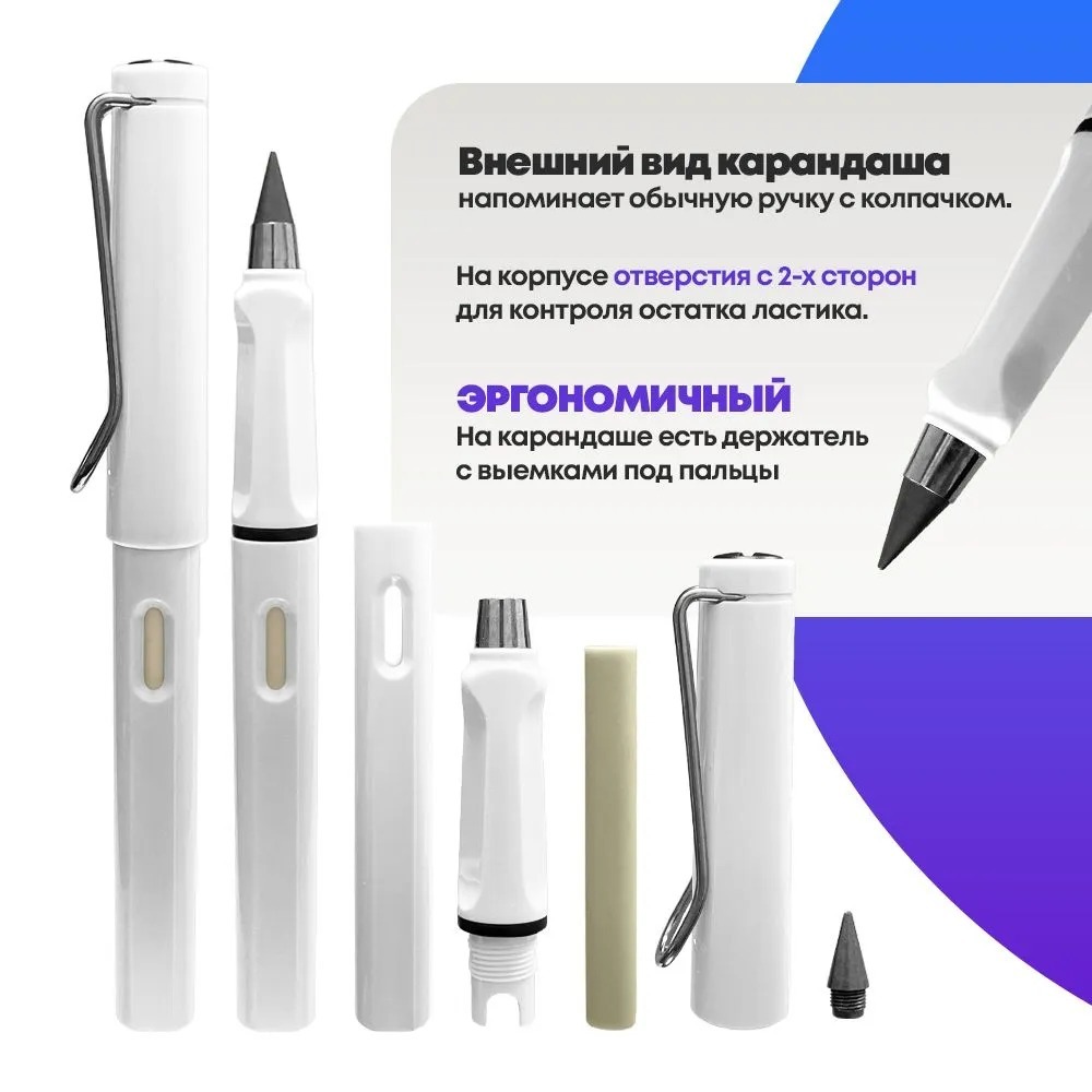Особенностью является встроенный мягкий ластик, расположенный внутри корпуса. Он обеспечивает легкость стирания написанного. Вечный карандаш с ластиком – это идеальный инструмент для тех, кто ценит качество и удобство.